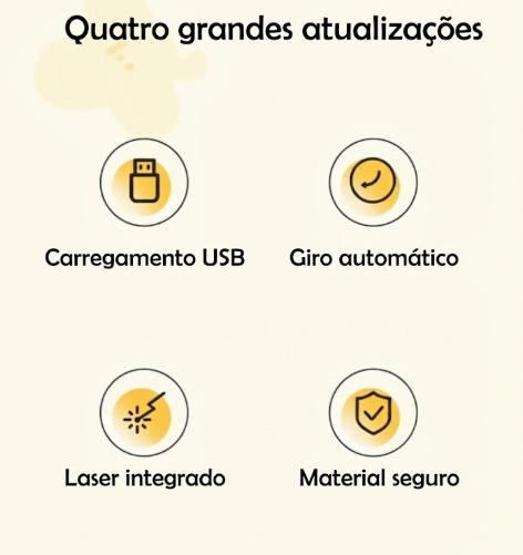 Recarregável via USB Tipo-C: Esqueça a compra constante de pilhas. O brinquedo vem com uma moderna porta de carregamento USB-C (cabo incluso, conforme ícone), garantindo carregamento rápido e fácil em qualquer porta USB, notebook ou adaptador de celular.